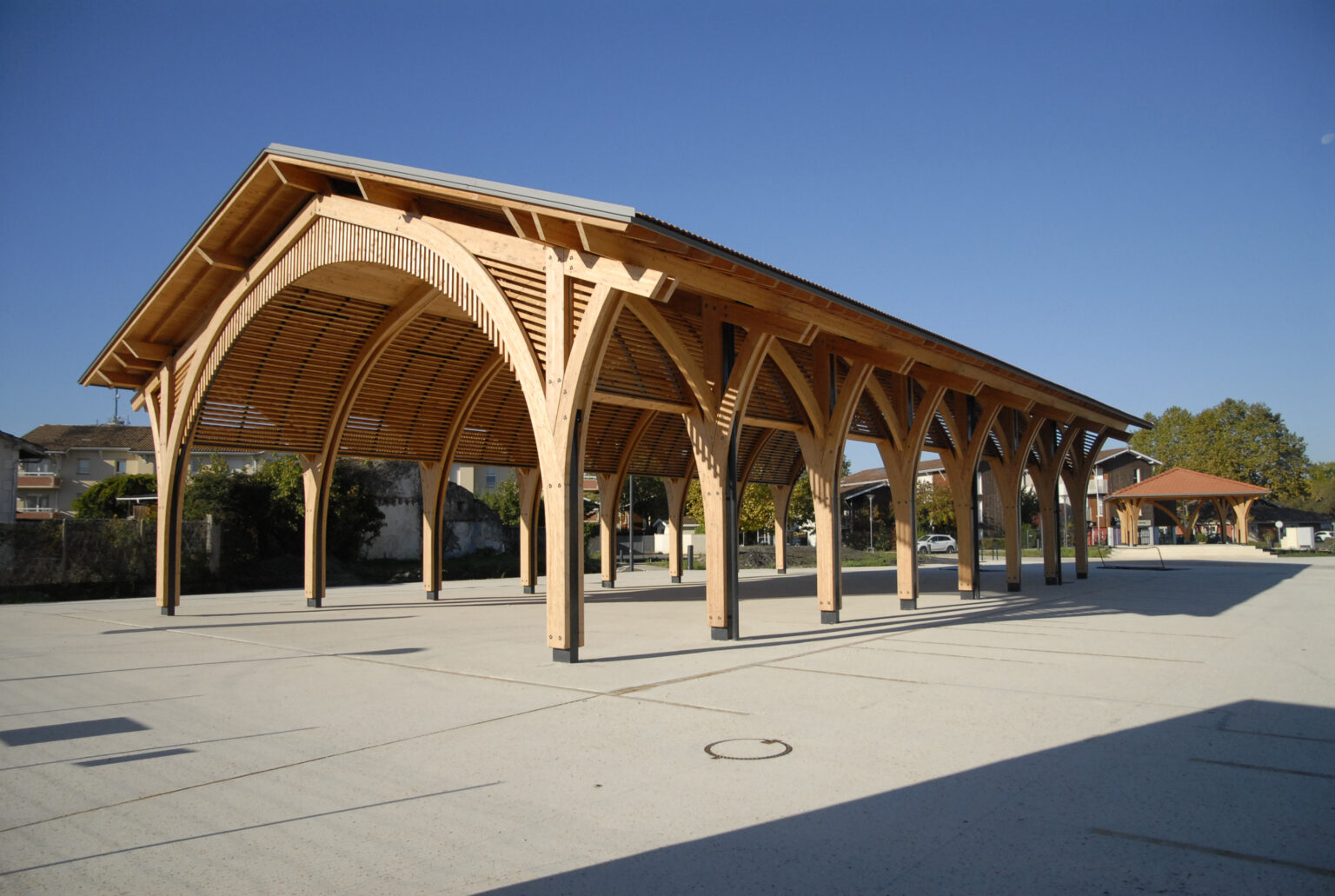 – Créer une place centrale : La place se développe dans un écrin de verdure, rappel des forêts galeries propres aux paysage local, qui traversent la forêt des Landes.
